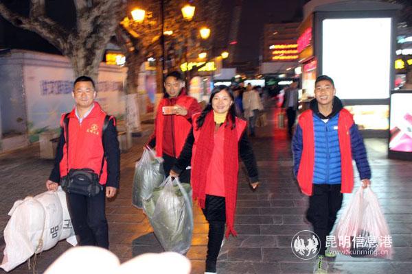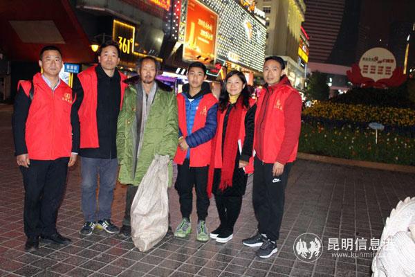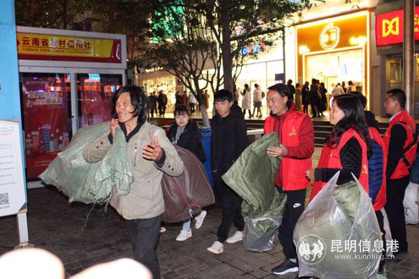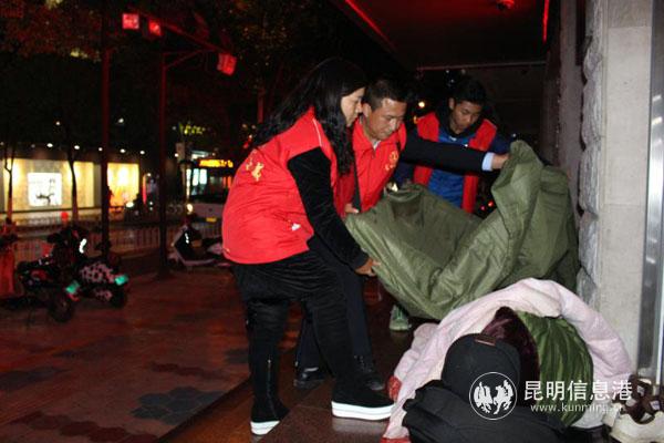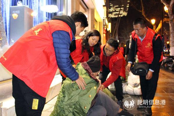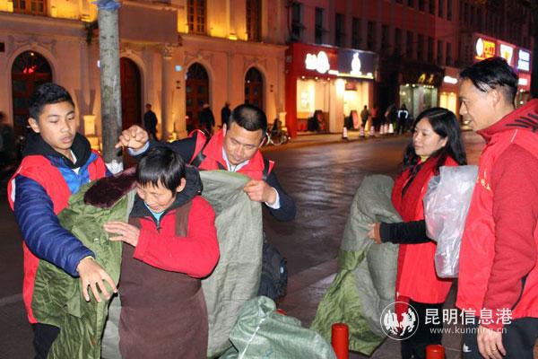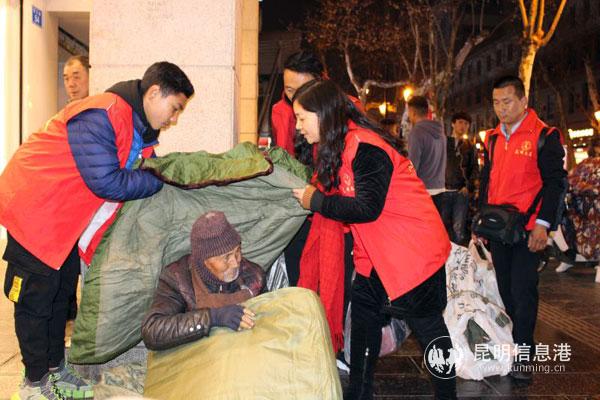 大寒夜晚的昆明冷风飕飕,行人裹紧了厚厚的棉衣。志愿者从青年路口的省美术馆出发,沿着威远街、南屏街、正义路、宝善街一路寻找流浪者。在威远的一屋檐下,两个流浪者盖着一床薄薄的被子蒙头睡下,冷的瑟瑟发抖。志愿者一一给他们发棉大衣穿上,盖上棉被。