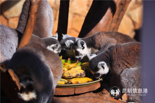 在这样喜庆的日子里,自然也少不了可爱的环尾狐猴们。这群来自马达加斯加的小精灵们喜欢吃树叶和果实,而自从来到云南野生动物园,便极其喜欢饲养员提供的香蕉。