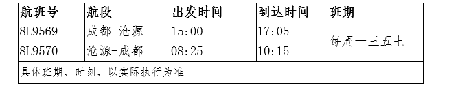 航线开航初期正值春运,可新增两地间交通往来方式,为旅客春节返乡、探亲提供更多保障。成都-沧源航班号为8L9569/70,每周一、三、五、七执飞。