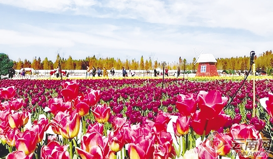 春节期间,捞渔河湿地公园姹紫嫣红、蜂飞蝶舞,市民置身于浪漫、美丽的郁金香胜境,或别有一番韵味。(云南网 记者孙琴霞 实习生彭婷婷)