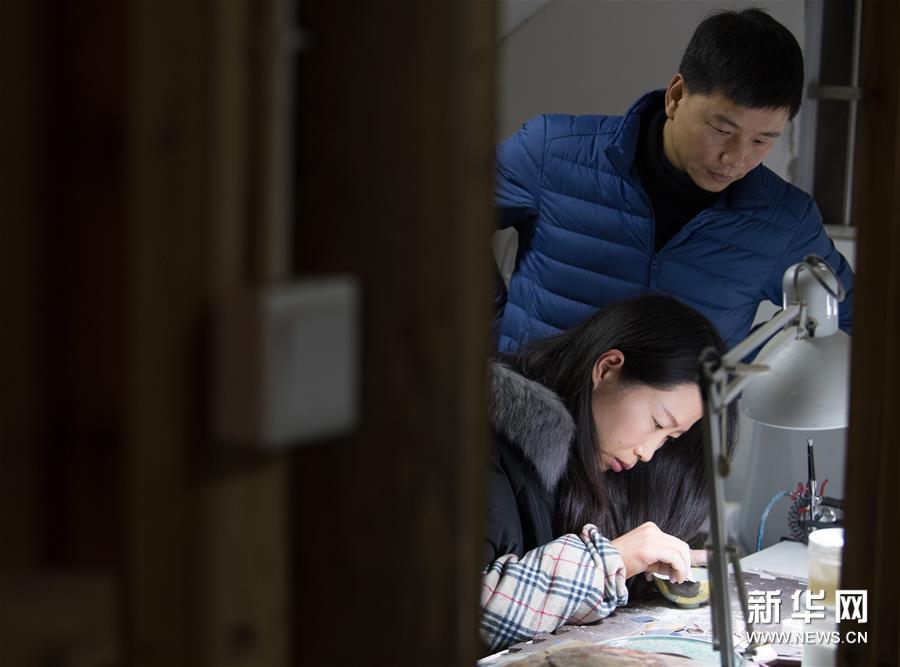吴荣强和妻子李淑敏在龙泉市牛头岭村“七分醉”工作室对一件漆缮器皿进行打磨