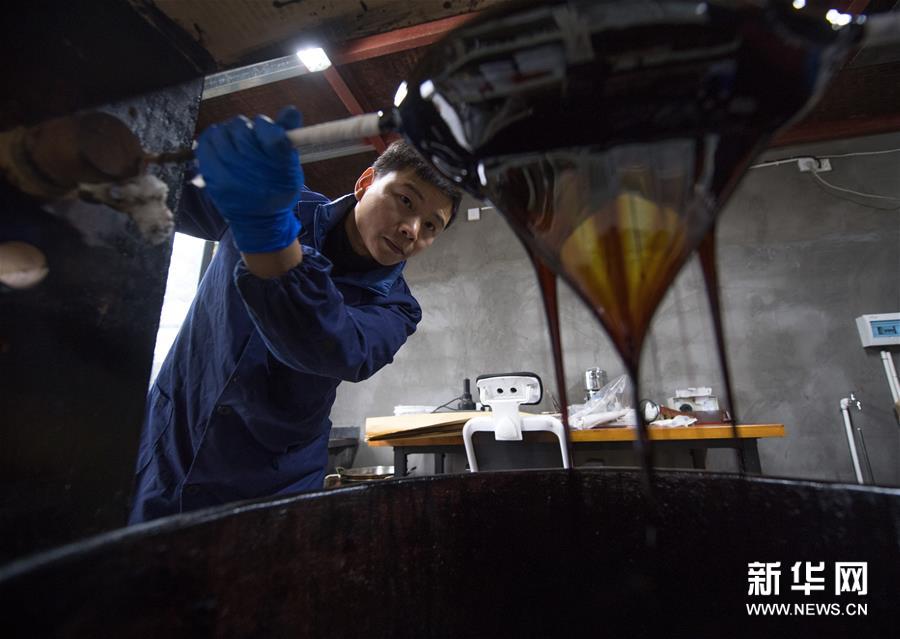 吴荣强在龙泉市牛头岭村“七分醉”工作室精制大漆
