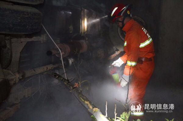 当晚9时5分许,救援人员到达现场。经现场查看得知是一张小车追尾货车,货车驾驶员被困,并且货车油箱因碰撞破损而漏油,情况十分紧急。