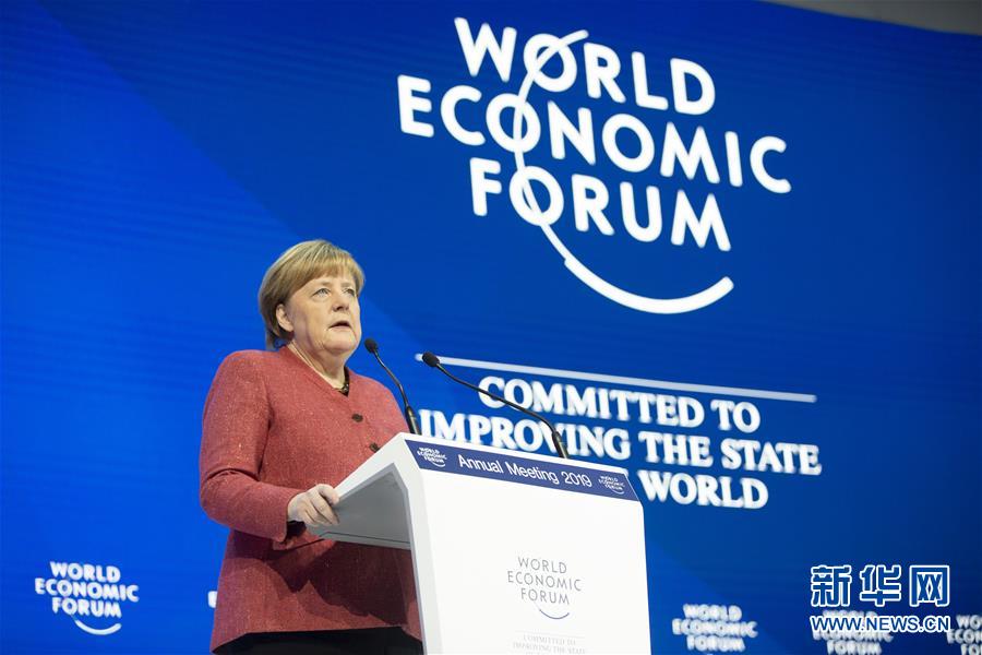1月23日,在瑞士达沃斯,世界经济论坛创始人兼执行主席克劳斯·施瓦布(左)欢迎德国总理默克尔。当日,在瑞士达沃斯举行的世界经济论坛2019年年会进入第二天。在为期4天的会议期间,来自全球政界、商界、学界的3000多位嘉宾围绕近400个话题进行交流。 新华社 记者徐金泉/摄