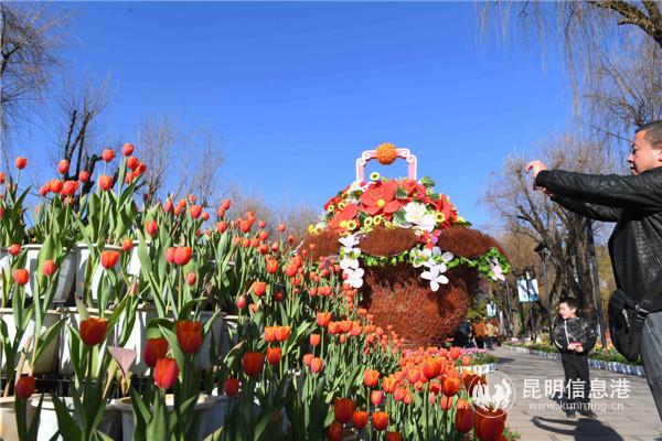 虽然还是冬日,但大观公园内已是一片春意。蓝天白云暖阳之下,各色郁金香争相绽放,在微风中轻轻摇曳,更显婀娜美丽。今年大观公园郁金香花展以“年味大观·迎新春·闹元宵”为主题,公园内张灯结彩,已呈现出浓浓的节日氛围。沿着公园正门进入,以“郁金香”为主角打造的一组花篮景观惹人注目,高大的花篮吸引了游客驻足合影。除了“花篮”之外,“送财童子”“迎春”“闹元宵”“新春快乐”园林造景也都年味十足。