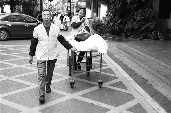 很多骨伤病人从入院、做检查,再到出院,全靠王庭昌和曹德陆用担架运送,他们运送过的最重的病人有200多公斤,加上家属4个人才抬得动。好在家属们都很尊重他们的职业,这让他略感欣慰。