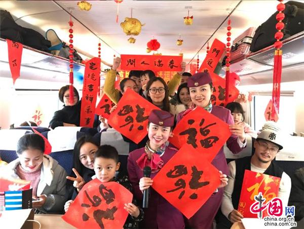 “还有一周将迎来传统的小年,今天带着乘坐动车送的福字和春联,回家就是稳稳的幸福!”,家在云阳的王先生激动不已。“在车上一起唱《回家的路》,一起玩春联填字游戏,好嗨哟!”下了动车就要赶回奉节老家过年的李女士一脸灿烂的笑容。