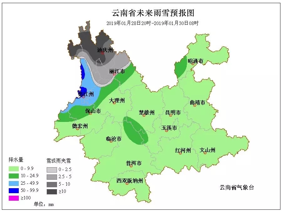 据云南省气象台预测,受南支槽前西南暖湿气流影响,预计1月28日夜间至30日上午滇西北、滇西边缘将出现中到大雨局部暴雨,迪庆、怒江北部、大理北部及丽江西部高海拔地区有中到大雪局部暴雪。预计过程累积降水量20~40毫米,局地50~70毫米;累积降雪量4~8毫米,局地10~20毫米。
