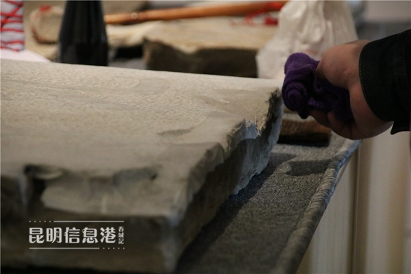 随着水在纸上氤氲开来,物件的纹理开始凸显在宣纸上,一幅清晰的画面徐徐展开。当然,想要宣纸与碑文实现更紧密的贴合,还需要使用棕刷对有气泡的地方进行清扫、再使用小木槌敲击封边。经过自然风干,湿纸由青变白,当纸张达八九成干时,原先清晰的纹理也随着水分的蒸发只留下凹凸的痕迹。