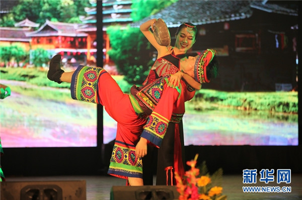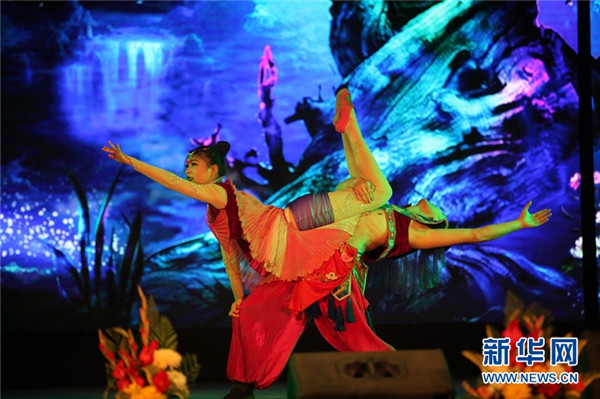 1月27日,在尼泊尔加德满都市中心的尼军俱乐部内,魅力文旅发展有限公司的演员在表演舞蹈《相爱山水间》。当天,尼泊尔中国文化中心和中国湖南省文化和旅游厅联合主办“欢乐春节·锦绣潇湘”为主题的演出,吸引了数百人前来观看,反响热烈。新华社 记者周盛平/摄