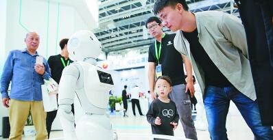 在河北石家庄举行的国际数字经济博览会上,参会嘉宾与展会上的机器人产品互动。新华社发