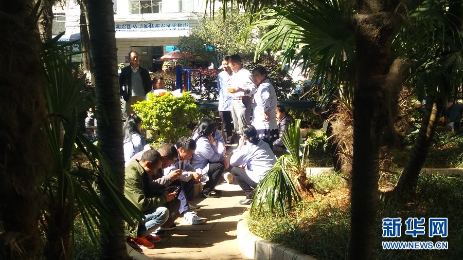 图为护工在花园里休息聊天。(新华网潘越/摄)