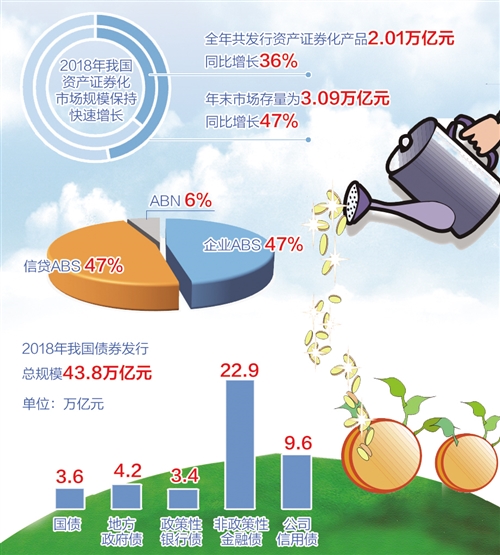 上述报告显示,2018年我国资产证券化市场规模继续保持快速增长态势,全年共发行资产证券化产品2.01万亿元,同比增长36%;年末市场存量为3.09万亿元,同比增长47%。
