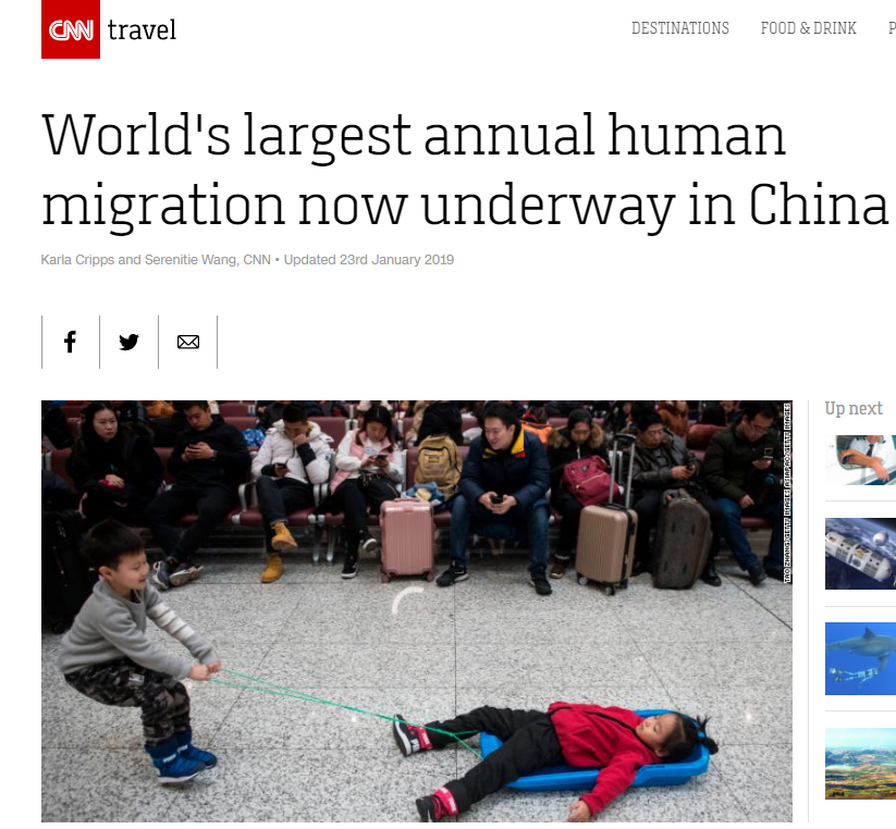 美国有线电视新闻网(CNN)1月22日发表了题为“全球最大年度人口‘迁徙’正在中国上演”的文章。文章称,在任何其他国家,如此大的客流量都会让当地的基础设施陷入瘫痪。不过,中国跟任何其他国家都不一样,中国已经做好了充足准备来应对这些人流。文章同时指出,为了应对好今年的春运高峰,目前已拥有世界上最长铁路网的中国在2018年底又新开启了10条铁路线。这将中国高铁的运营里程扩大到了2.9万公里。此外,中国还引进了诸如面部识别软件和无票出行等新的技术来缓解火车站的拥堵。