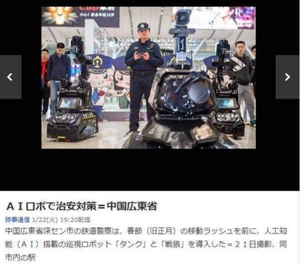 日本两大通信社之一日本时事通信社1月22日报道称,中国广东省深圳市的铁道警察们在春运高峰前,启用了搭载人工智能(AI)的巡逻机器人“坦克”和“战狼”。