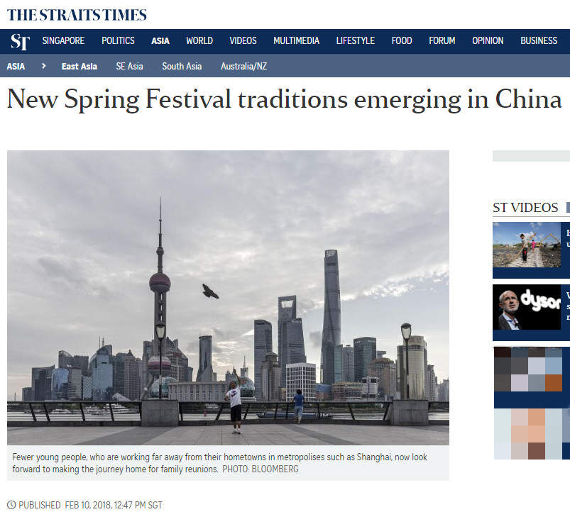 新加坡《海峡时报》网站2018年2月10日报道称,根据最近发布的一份报告,更多中国家庭选择在国内度假村或海外旅游地度过春节假期,而在大城市工作的年轻人现在更倾向于邀请他们的父母来他们家庭团聚。传统上,人们从他们工作或学习的地方返回家乡庆祝春节。《海峡时报》还采访了一位从北京返回江西老家的乘客Zoey。在高铁开通前,Zoey坐火车回家需要11个小时,但现在只需6个小时。报道称,以前中国人在坐火车长途出行时最喜欢的食物是方便面,但现在Zoey可以在网上订餐,订的餐能从指定站点送上火车。除了解决吃饭问题,Zoey还事先从网上下了几部电影,“我看完电影的时候就到家了”。报道指出,除了火车、飞机、自驾之外,滴滴等公司推出的春运拼车也被越来越多的人所接受。