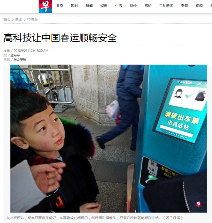 新加坡《联合早报》网站称,今年的中国春运采用大量高科技手段,如自助刷脸机、人像识别警务眼镜、虚拟实境全景导航和智能机器人等。而这些集中在本次春运亮相的高科技,让历来以天量人口流动而闻名的中国春运颇显科技范儿。在人流聚集的北京、上海、深圳等多个城市的火车站,自助刷脸进站机的上岗缓解了往年排长龙安检的情况,让乘客出行更便利。