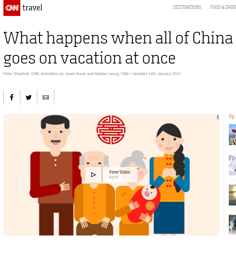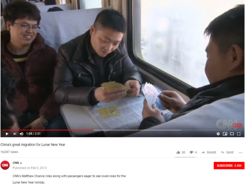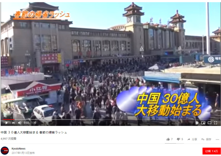 CNN在YouTube上发布了关于中国春运的视频,称中国人在春节期间之所以想方设法都要回家,是因为他们渴望与所爱之人团聚。