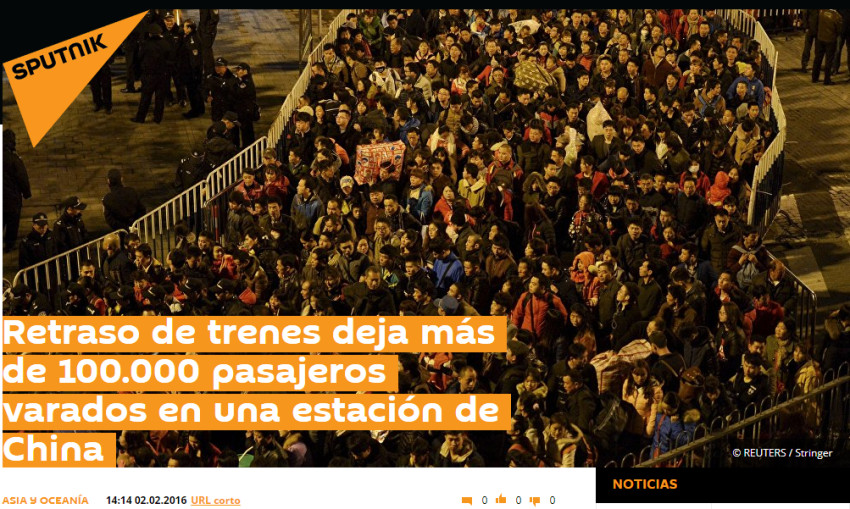 俄罗斯卫星通讯社西班牙语网站报道称,2016年,为期一周的春节假期从2月7日开始。在南部城市广州,因为恶劣天气导致火车晚点,2月1日有10万人滞留广州火车站。