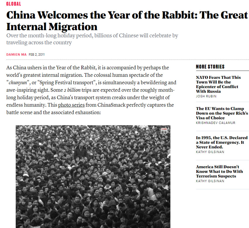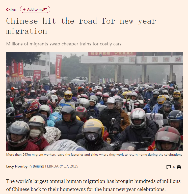 对于“春运”,外媒的报道几乎每年都是“震惊体”,诸如“全球最大年度人口迁徙”、“每日运送的旅客数比许多国家的人口还要多”、“以每秒钟超过1000张的速度在网上购买火车票”等。