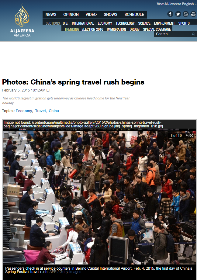 2015年2月5日,卡塔尔半岛电视台英语网站以一组春运图片呈现出了中国“春运”的规模之大。