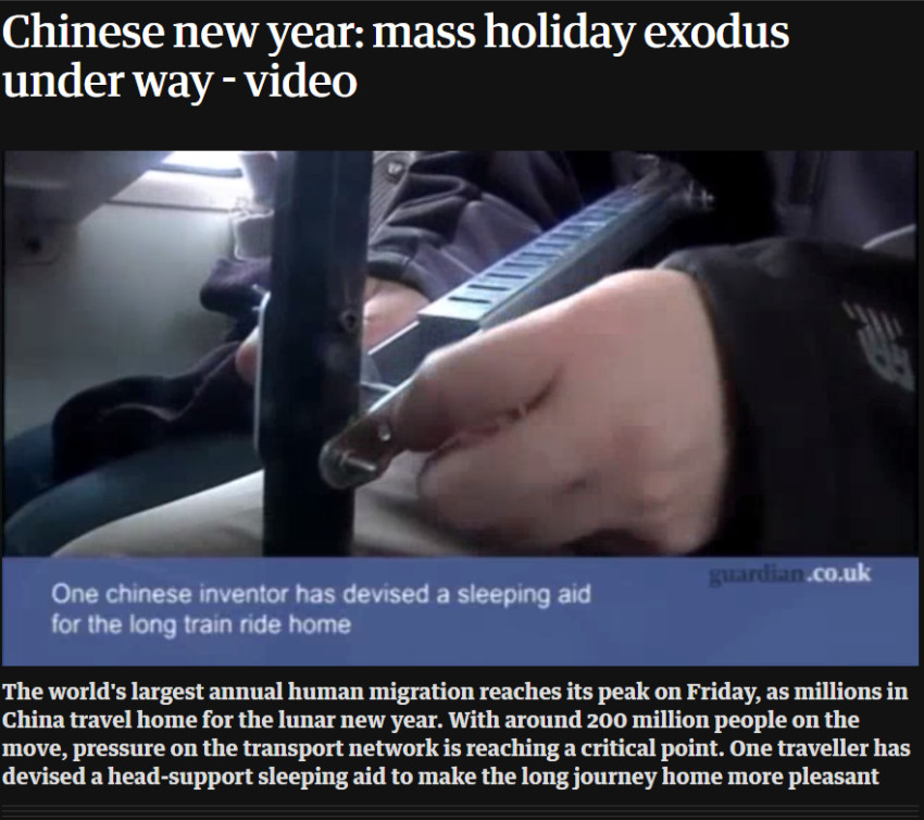 英国《卫报》网站报道称,春节期间,由于人流太大,回家的旅途中会有许多不舒适之处,但人们仍然会长途跋涉回家。这是因为在辞旧迎新之际, “最重要的事情就是和家人在一起”,“家人总是排在第一位”。而为了让旅途更舒适些,人们也是奇招频出。例如,一名旅客自己设计了一款“助眠神器”,它可以支撑头部,从而减轻坐着睡觉时颈椎压力。