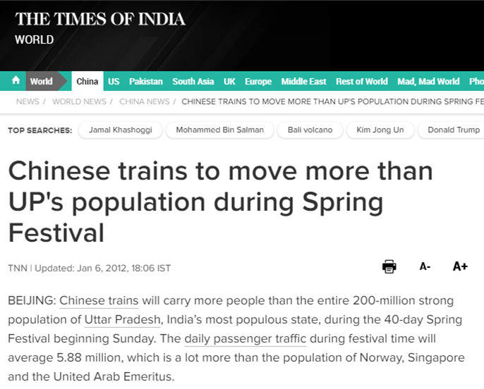 《 印度时报》网站2012年1月6日报道称,中国铁路发送旅客数量超过了印度人口最密集邦——北方邦的人口数量。春节期间,中国平均每天发送旅客588万,这个数字远远超过挪威、新加坡、阿拉伯联合酋长国的全国人口数量。