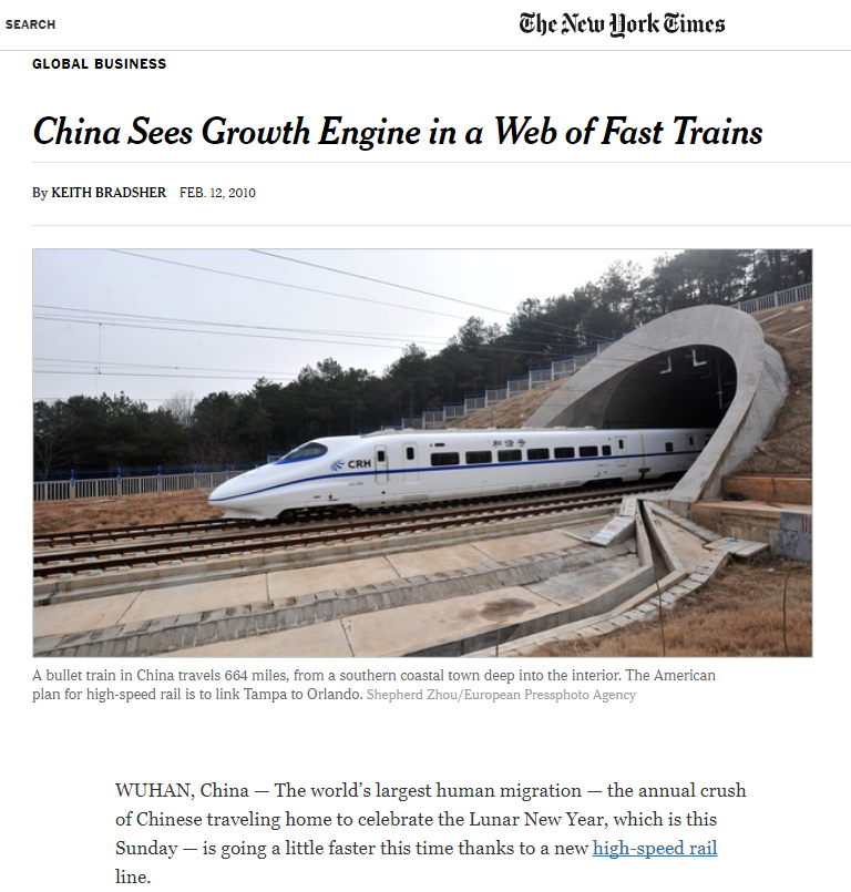 《纽约时报》2010年2月12日报道称,世界上规模最大的年度人口迁移 ——中国“春运”——正在上演。而今年,由于一条新通车的高速铁路线,中国人的回家之路变得更顺畅了,他们可以快点回到家和亲人一起庆祝新年了。