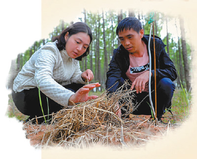 内蒙古阿尔山市西口村驻村第一书记李绘新(左)查看赤松茸生长情况。资料图片