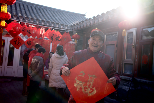 32号院合住着几户人家。总书记拿起一个“福”字,亲自贴在小院“院长”的门上,并祝愿街坊邻居们永远幸福。