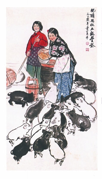 进入20世纪,猪开始成为画家们笔端的常客。齐白石晚年就经常描绘自己儿时在故乡星塘老屋外牧猪的景象。像他这样以亲身经历来画猪的画家恐不多见,因此其笔下的猪总是天趣盎然、栩栩如生,延续了传统绘画中的自然趣味。同样的趣味,我们在后来董希文绘于1961年藏区写生时期的油画《小白猪》里也可以感受到。画中正在喂猪的藏族小女孩与小白猪和谐相处,平淡而天真。