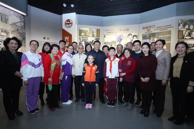 △2019年1月17日上午,习近平在天津和平区新兴街朝阳里社区志愿服务展馆同志愿者们合影。