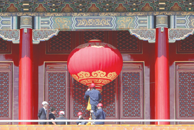 当时,由于灯笼太大,工期又短,没有人敢承担这项工作。闫树军介绍,最后,苏凡找到了一位住在西城区丰盛胡同70多岁的扎灯老艺人,他和两个弟弟来到了天安门城楼手工制作灯笼。整整三天三夜,他们全都吃住在城楼上。“十一”前一天,8盏有史以来最大的灯笼扎成了,每个高2.23米,直径2.56米。张致祥调来一队解放军战士,忙活了好一阵子,才把这几个灯笼挂到10根廊柱之间。最终,开国大典上,8个大红灯笼飘着阳光般的流苏,和节日的天安门融为一体,让古老的城楼青春焕发。(记者贺勇采访整理)