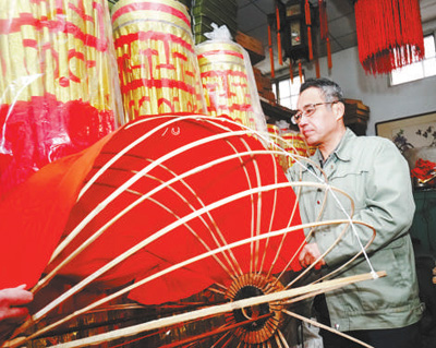 1981年入厂的郭燕青介绍,传统工艺制作灯笼需要十几道工序。先将毛竹劈成板,破成竹条;将木材旋成外圆内空、薄厚一致的上下灯盘;把竹条两端用铁丝穿好,嵌入灯盘凹槽并固定;灯簧贯穿上下两个灯盘,灯簧有用粗铁丝窝成的,也有用铁管打眼制成的,这样就制成了灯笼的骨架。然后整理好骨架周正的圆形,用小线固定,防其走样。随后在骨架上糊胶,将红色布料仔细贴在上面,最后用金纸剪成的如意云朵、万字不到头装饰,一个灯笼制作过程才算大功告成。