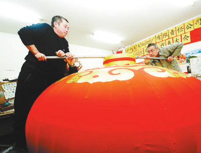北京市美术红灯厂工人将红色布料贴在骨架上。