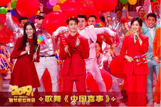 开场不久后上演的歌舞秀《中国喜事》可以说是热闹非凡。《中国喜事》由迪丽热巴、张艺兴、凤凰传奇、钟汉良、周冬雨等人合体献唱,几人都是红装亮相,加上热闹的歌舞,让人感觉到春节的欢快。