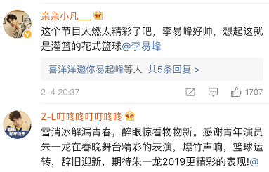 节目吸引了大批粉丝关注,纷纷在“春晚”官微下“打卡”留言,为朱一龙、李易峰打CALL。