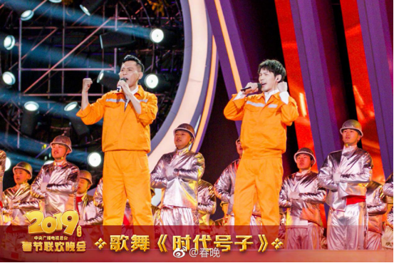 而成龙、陈伟霆、邓伦献唱的《我奋斗 我幸福》在春晚下半场亮相。歌曲描绘了在飞速发展的新时代里,人们昂首阔步,奋斗前行的画卷。这一节目中,成龙负责国民度,后两人负责流量,无论流量和咖位都够分量。