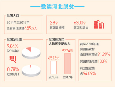 党的十八大以来,河北省认真贯彻落实习近平总书记关于扶贫工作的重要论述,切实提高政治站位,持续不懈发力,加快补齐贫困地区这个短板。牢牢坚持精准二字,实施动态管理,既要说清楚有多少人脱了贫,又要说清楚怎么脱的贫。坚持志智双扶,因地制宜培育2000个贫困人口参与度高的特色产业基地,帮助有劳动能力的贫困人口实现稳定可持续脱贫。加大资源整合和政策倾斜力度,支持10个深度贫困县和206个深度贫困村实施基础设施和基本公共服务提升工程,全力以赴攻克坚中之坚、贫中之贫。夯实脱贫攻坚的组织保障,推广承德市“脱贫攻坚党旗红”经验,整顿软弱涣散村党组织,选派2.2万名干部驻村帮扶,组织32.5万名干部与贫困户结对帮扶。