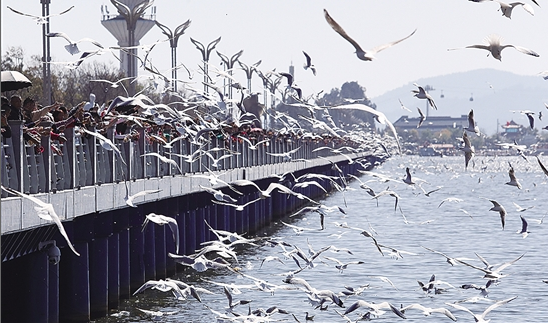 春节期间,来昆明海埂大坝观鸥喂鸥的市民游人络绎不绝,处处呈现人鸥和谐乐融融的靓丽景致。统计显示,红嘴鸥来昆明越冬至今已34年,在这样的冬日暖阳中约会昆明蓝,人鸥和谐成为春城最美冬景。大家在赏鸥的同时,也给环境带来了一些压力,希望各位往来滇池的游客文明出游,保护环境。(春城晚报)
