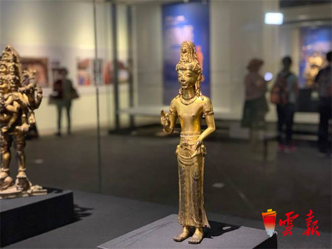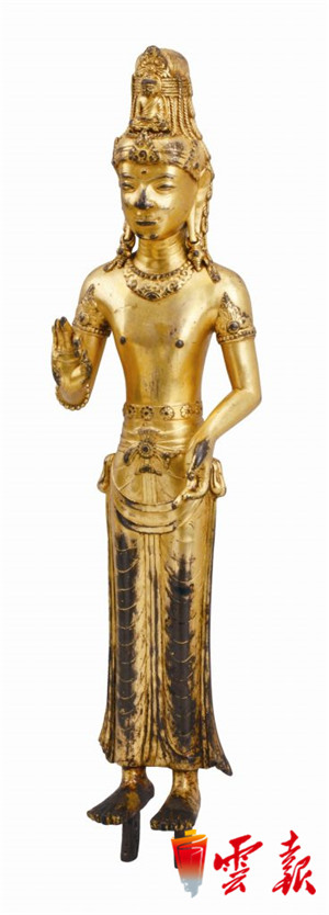 此次来台展出的铜鎏金阿嵯耶观音立像是宋代大理国(937——1253)时代文物,通体鎏金,身形纤细修长,高发髻,戴化佛冠,面带微笑,面下圆润而丰腴,眉如弯月,前额正中有白毫,秀目微睁;菩萨上身袒露,胸佩璎珞,臂腕環钏,腰饰花结,下着长裙紧贴双腿,衣纹清晰舒展,双手结妙音天印,赤足。据介绍,在云南省博物馆收藏的7尊阿嵯耶观音造像中,此尊的做工最为精致,面相也最为优美。
