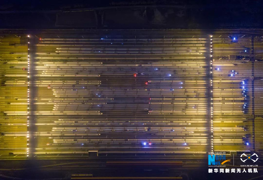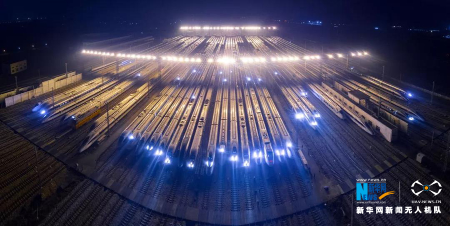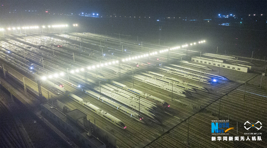今年春运,每当夜幕降临,百组“复兴号”动车组停靠在广州动车段各运用所上,整装待发,宛如“陆地舰队”。新华网发(宋兴华/摄)