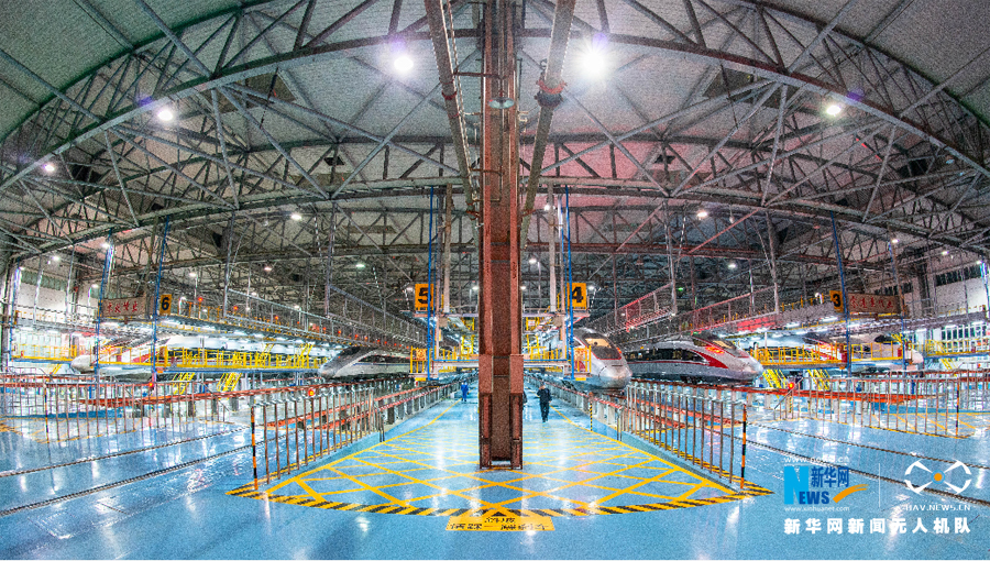 为保障春运期间高铁运输安全,广州动车段工作人员精检细修,全力提高“复兴号”动车组的检修质量,对车体转向架进行保温、检修等作业。新华网发 (曾小贤/摄)