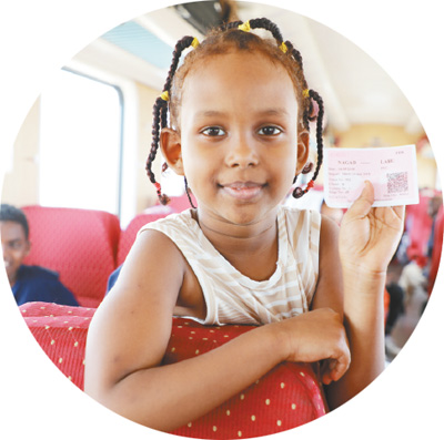 由中资企业承建的亚吉铁路,是非洲第一条跨国标准轨电气化铁路。图为列车上的小乘客向记者展示车票。记者吕强/摄
