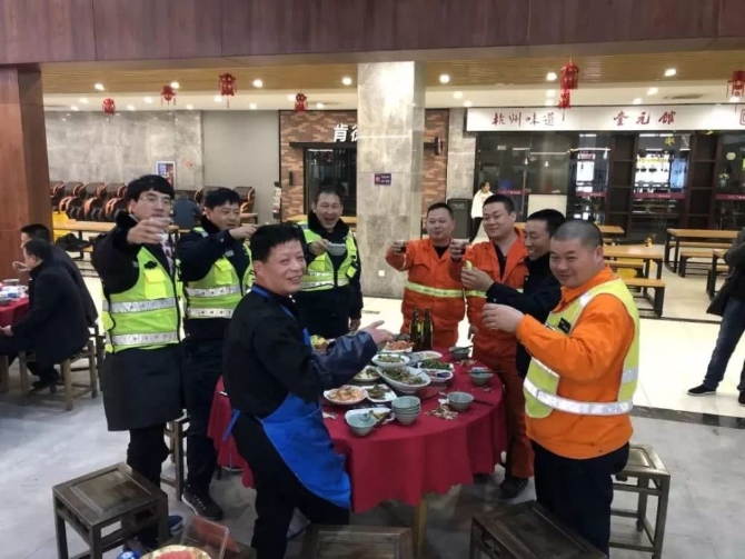 “过年啦!新春快乐!”2月4日下午4点半,在一片欢声笑语中,杭州萧山服务区的年夜饭开始了。有留守值班的同事,服务区里各个经营单位的员工,以及路政、交警等值班人员,70多人围坐在7张大圆桌边。餐桌上摆满了各种美味佳肴,大家有说有笑,处处充满着过年的喜庆气氛。