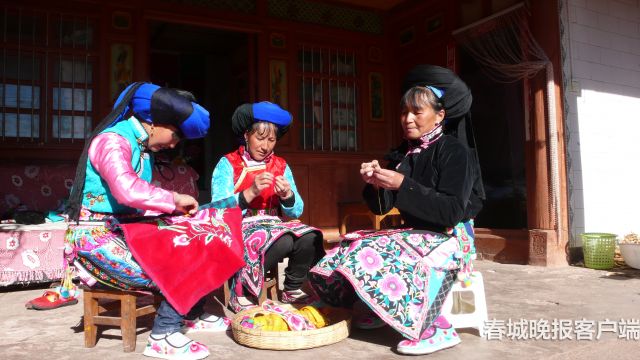 村子里,白族妇女个个会绣花。白天干农活,晚上生起篝火,围坐在火塘边绣花;到山上放牧,牛羊在前面走,自己绣着未完成的刺绣慢慢跟;有空闲,几个妇女也会围坐在一起刺绣,聊聊家长里短,看看别人绣的图案。今年,字勤飞57岁,也是这一门技艺的省级代表性传承人,时间的积淀为她手里绣出的图案增添了别样的韵味,村里的妇女们也喜欢让她带领着剪纸绣花。