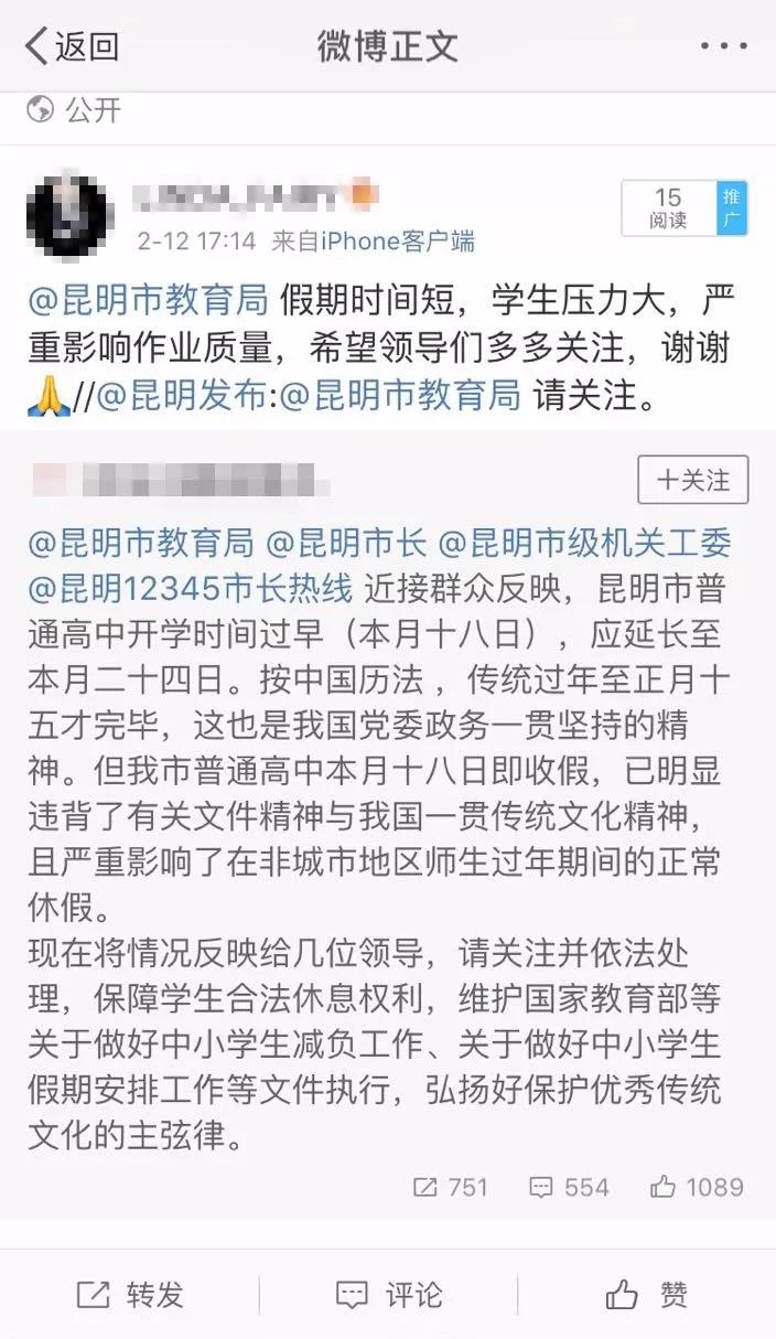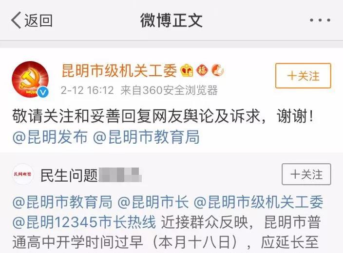 12日晚,昆明某高中的一位学生在微博上表示,昆明大部分普通高中将教育部规定的寒假收假时间从2月24日提前到了17日,认为学校提前开学违反了相关规定,引起了一些学生的转发和热议。