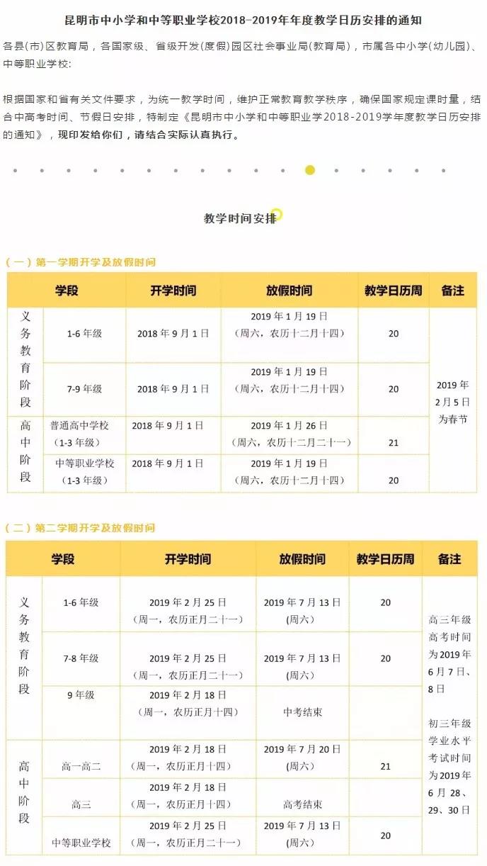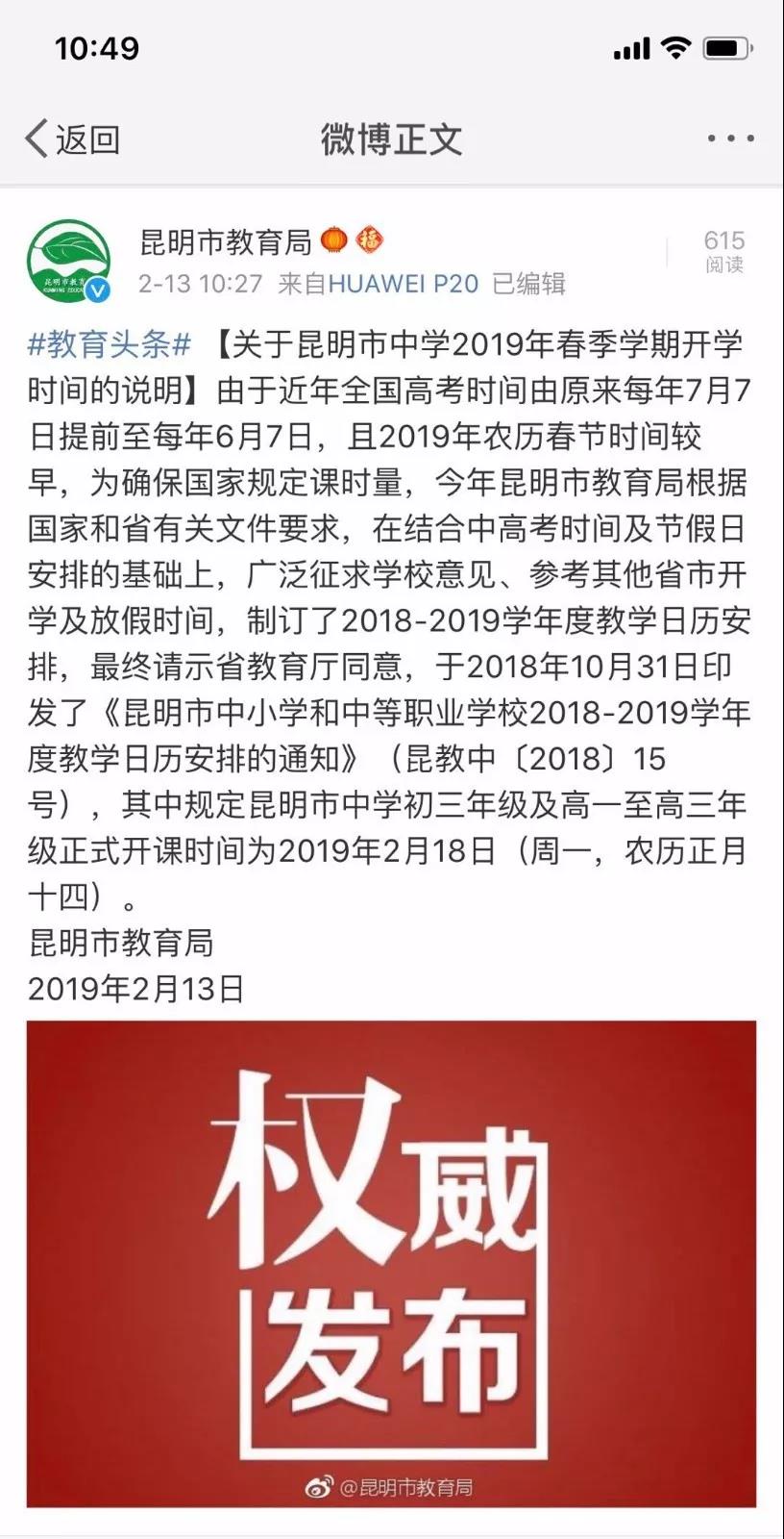13日上午,昆明市教育局也通过官方微博发布了《关于昆明市中学2019年春季学期开学时间的说明》。昆明市教育局表示,由于近年全国高考时间由原来每年7月7日提前至每年6月7日,且2019年农历春节时间较早,为确保国家规定课时量,今年昆明市教育局根据国家和省有关文件要求,在结合中高考时间及节假日安排的基础上,广泛征求学校意见、参考其他省市开学及放假时间,制订了2018-2019学年度教学日历安排,最终请示省教育厅同意,于2018年10月31日印发了《昆明市中小学和中等职业学校2018-2019学年度教学日历安排的通知》(昆教中〔2018〕15号),其中规定昆明市中学初三年级及高一至高三年级正式开课时间为2019年2月18日(周一,农历正月十四)。
