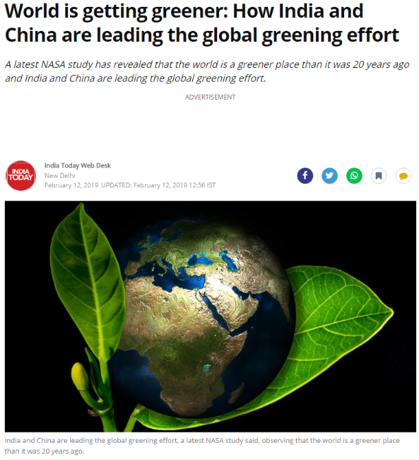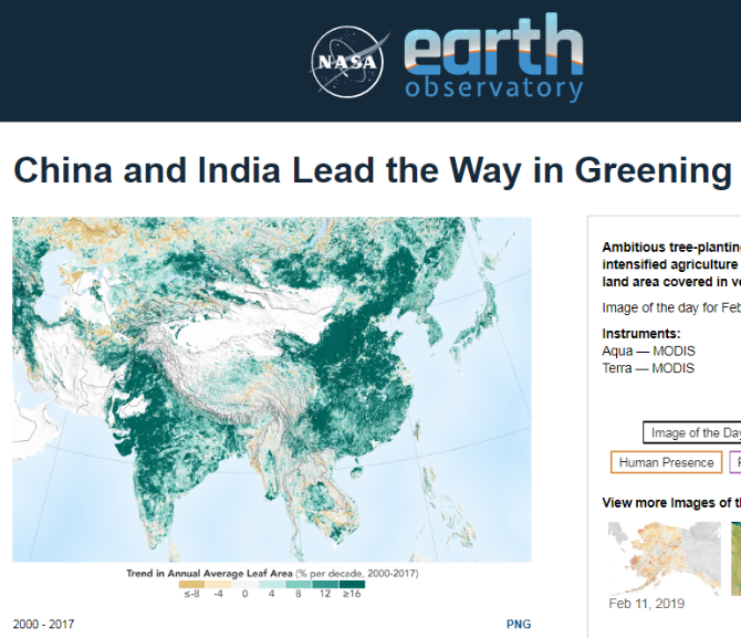 该报告的作者之一、NASA阿姆斯研究中心科学家拉马•内马尼(Ramakrishna R. Nemani)说:“当首次观察到地球变绿时,我们认为是由于气候变暖、变潮湿以及大气中二氧化碳增加所产生的施肥效应。直到有了MODIS数据,我们看到了人类(为地球变绿)所做的努力。”