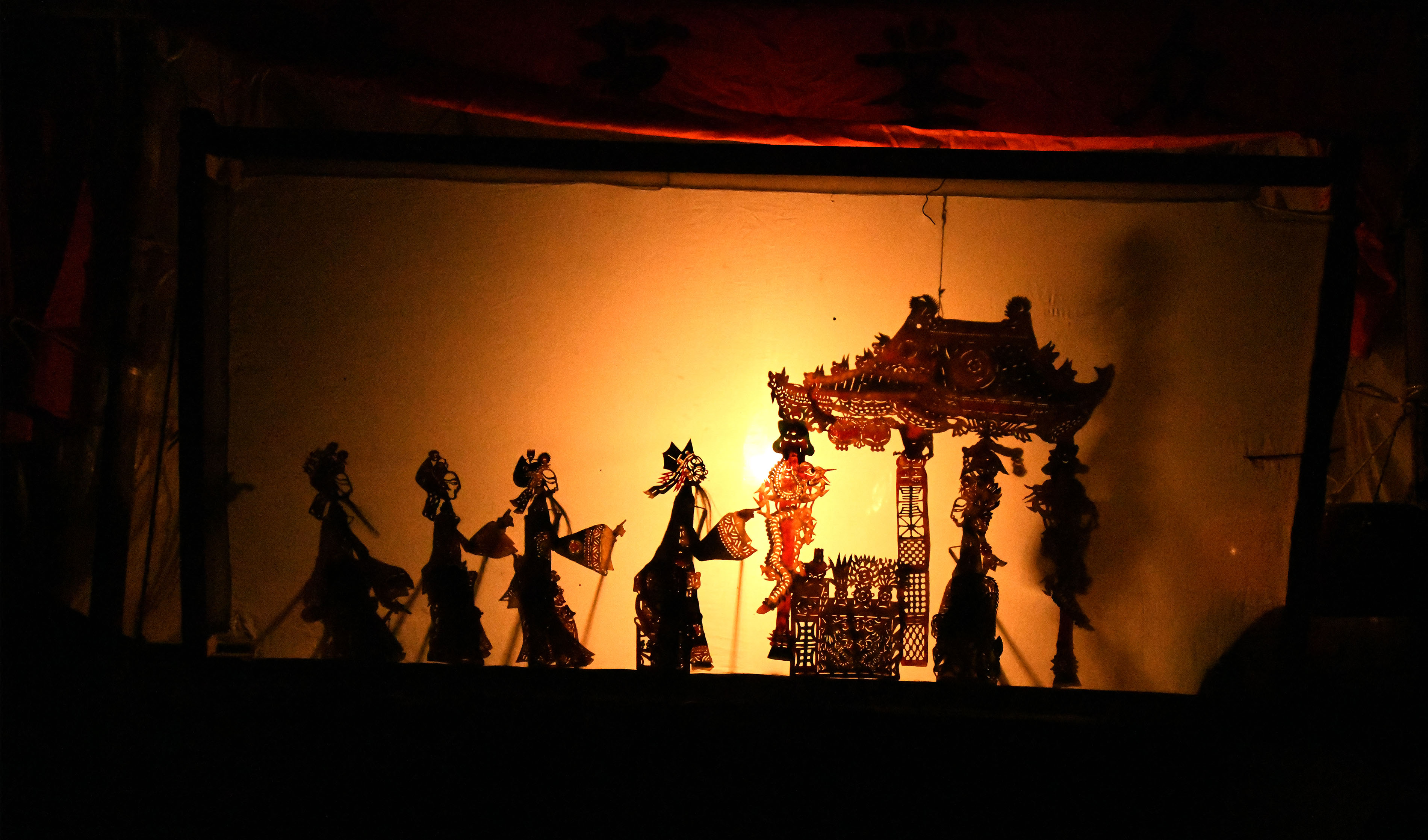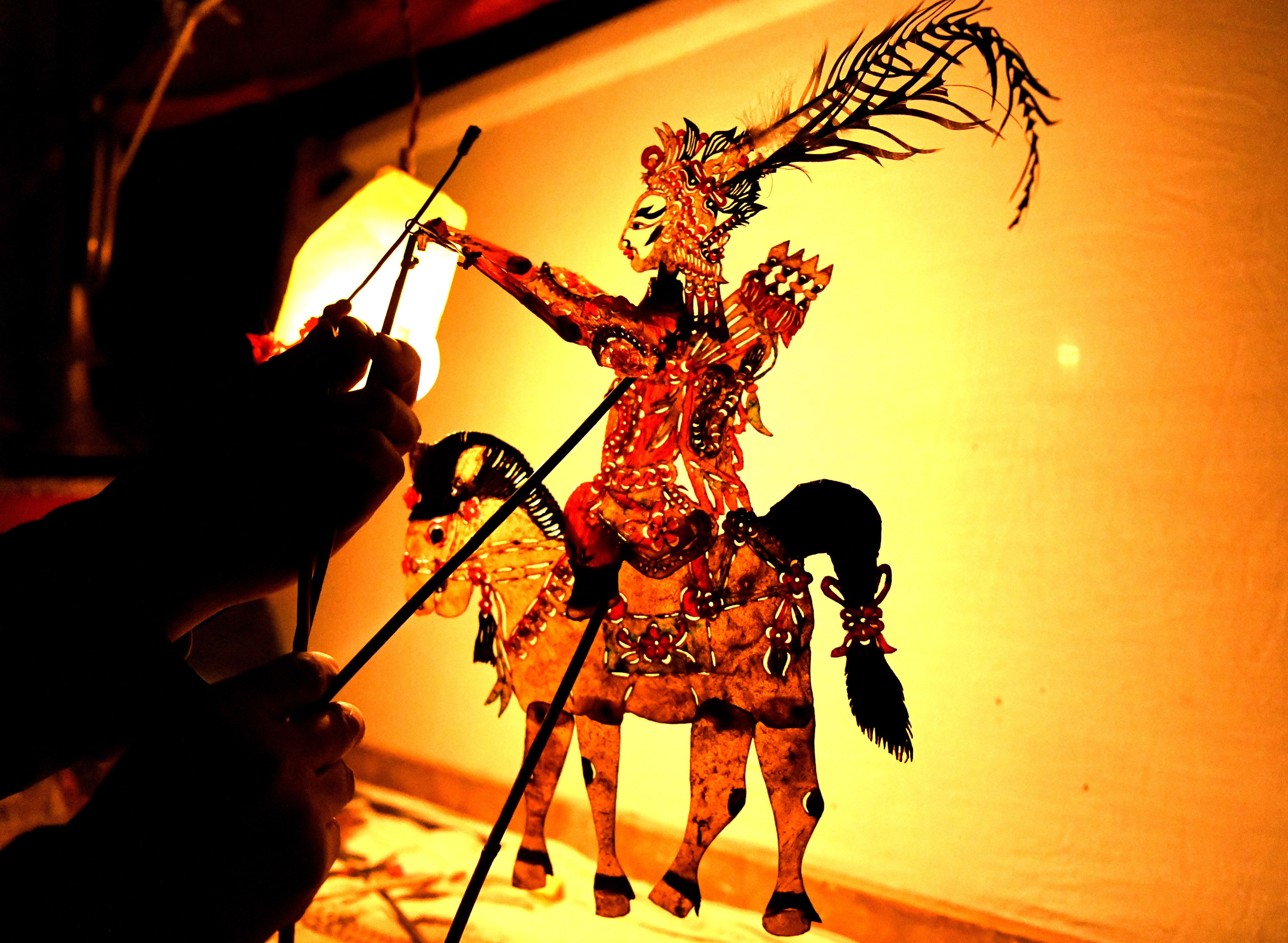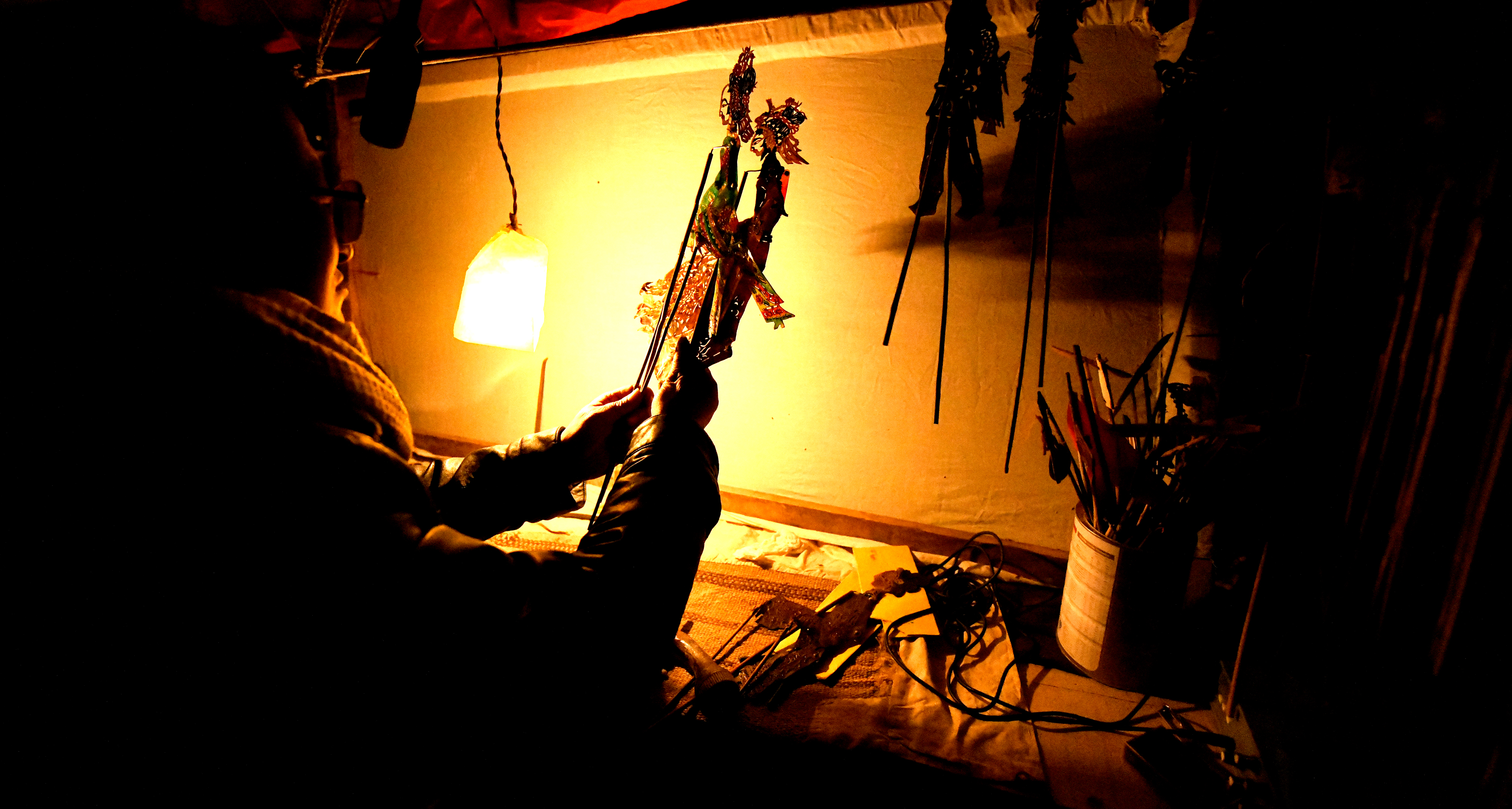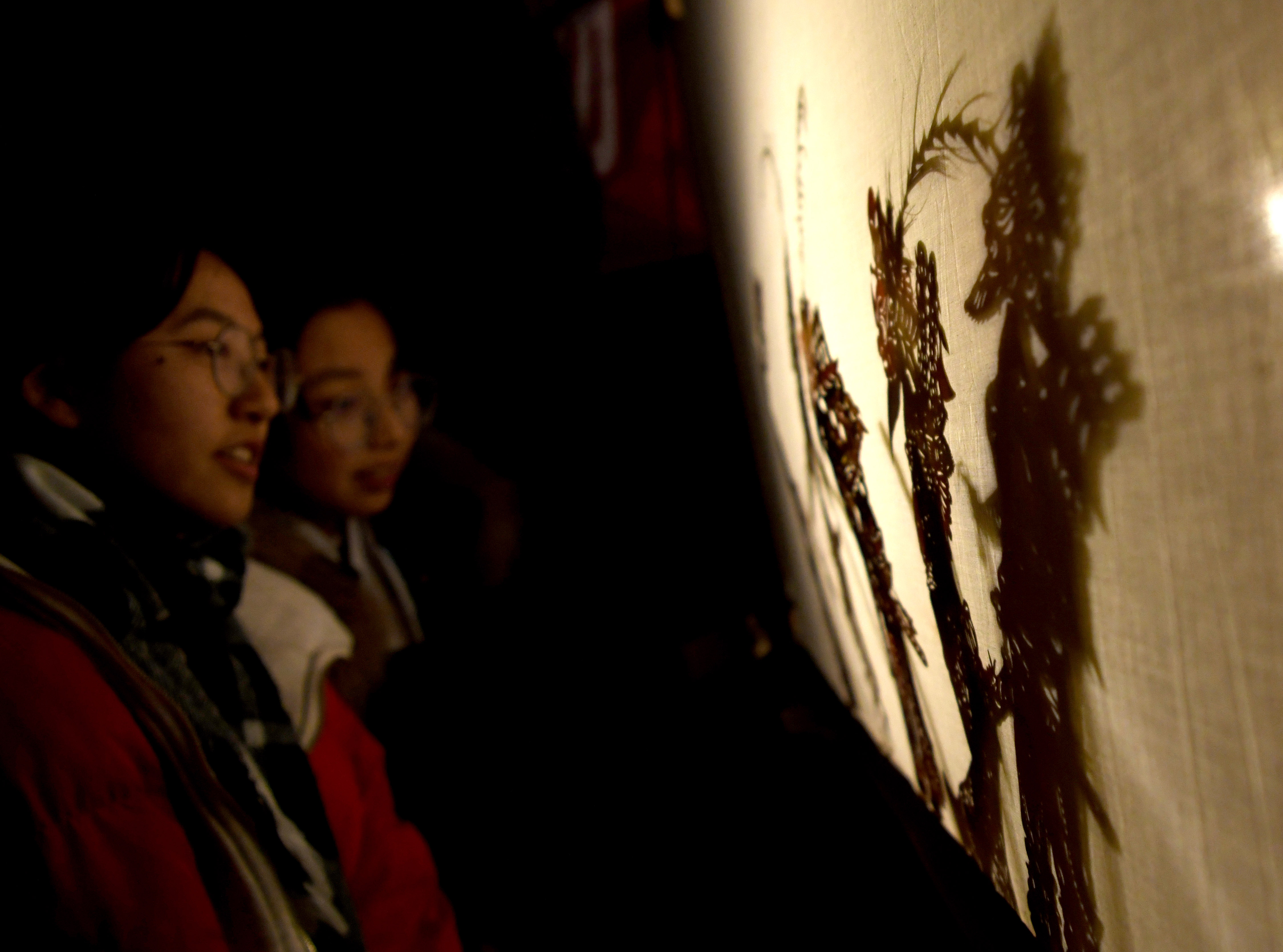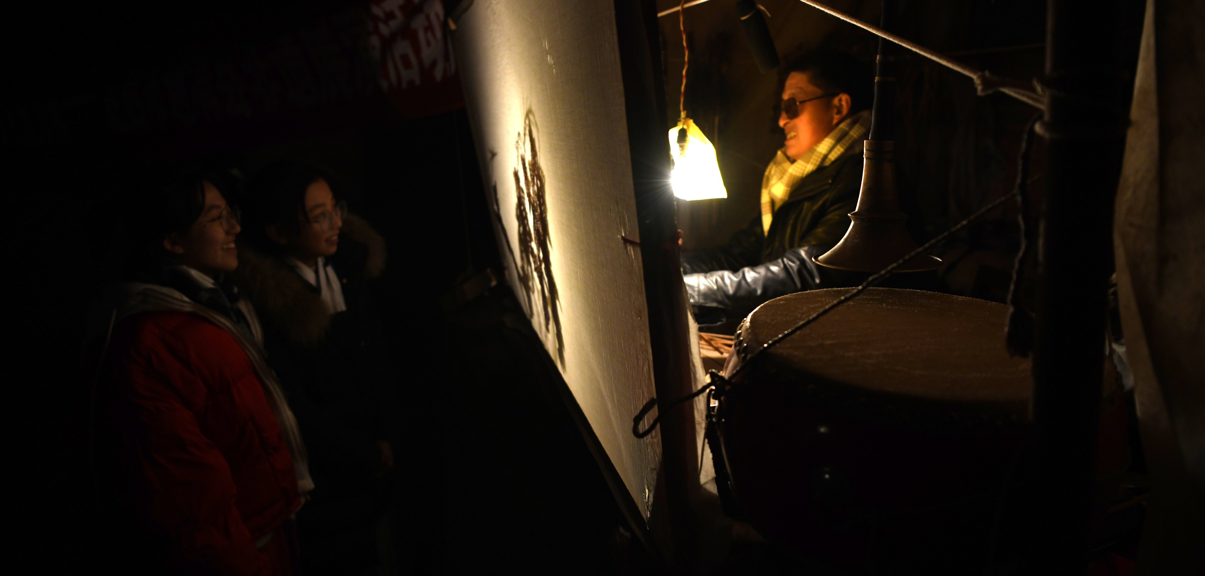2月12日,在甘肃省定西市渭源县清源镇崔家河村,民间艺人在表演皮影戏。